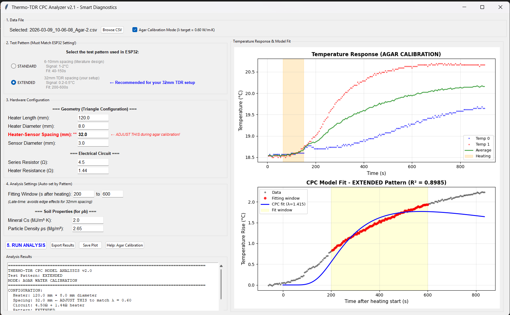 Soil tests with R² > 0.99 model fit. Agar calibration runs to characterise probe geometry. Iterative power and timing optimisation across multiple test cycles.